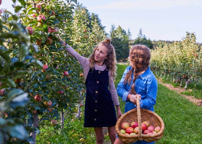Young girls enjoying a day of apple picking at Shields Orchard, Bilpin.